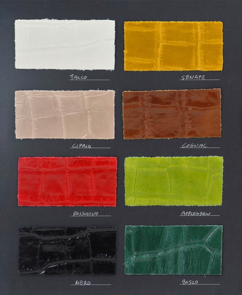 Pellame semi-lucido dall’aspetto venato in pieno fiore di vitello. Non pesante e allo stesso tempo resistente perchè sottoposto a speciali procedimenti che lo rendono impermeabile e facile da pulire. Viene stampata a caldo nello strato superiore una texture coccodrillo. Questa pelle viene trattata con specifici oli e cere per accentuare le caratteristiche chiaroscurali e conferirle un aspetto vissuto ed elegante.