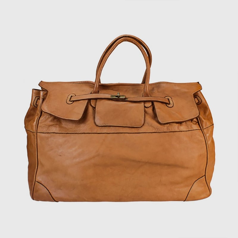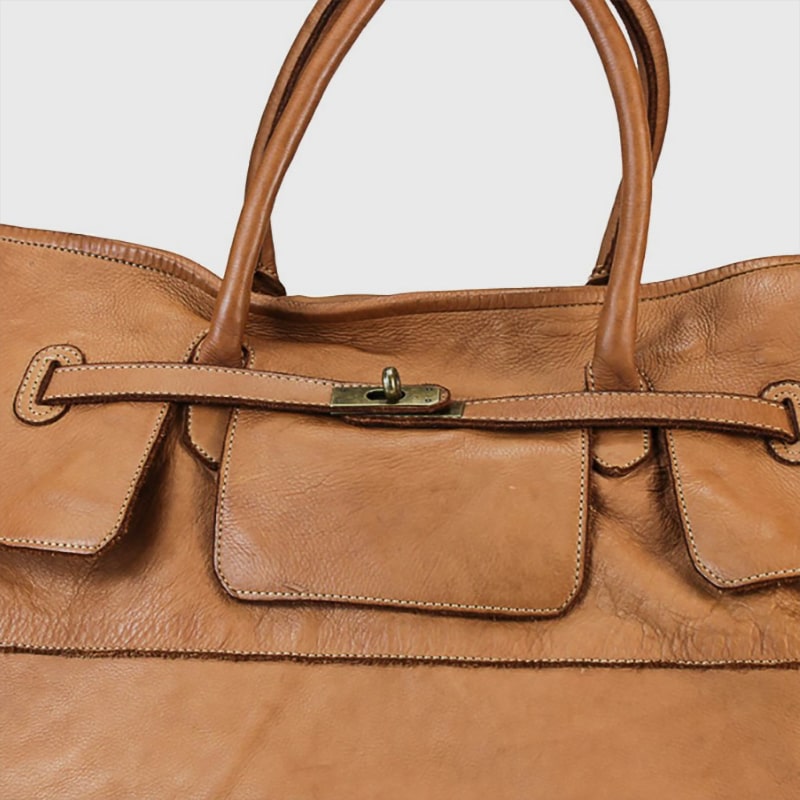 - il pellame, sottoposto ad un processo di tintura in capo, non è eterogeneo e la grana è irregolare, mentre le finiture sono ossidate, il tutto conferisce un aspetto vissuto e vintage al prodotto